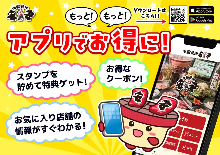 以下のサイト・アプリ内の「七輪焼肉 安安」各店舗ページより、クーポンを提示または予約時に適用してください。 |
