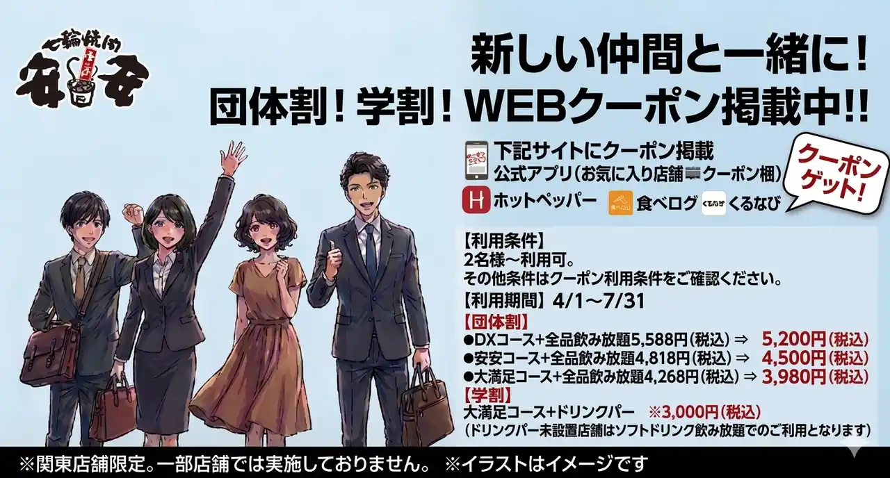 株式会社富士達が運営する「七輪焼肉 安安」は、2026年4月1日(水)から7月31日(金)までの期間限定で、関東店舗(一部店舗を除く)にて**「団体割!学割!WEBクーポン」**キャンペーンを実施いたします。 |