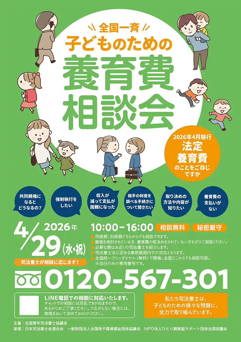 全国青年司法書士協議会(所在地:東京都新宿区、会長:岩田 豪)は、「全国一斉子どものための養育費相談会」を2026年4月29日(水・祝)10:00~16:00に開催いたします。 |