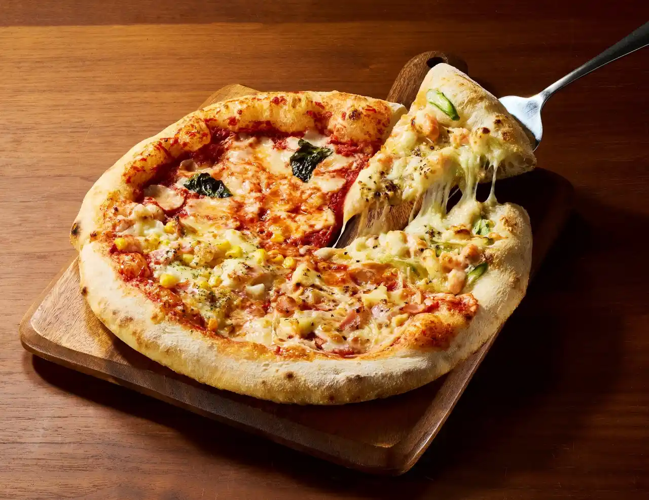 定番人気の「マルゲリータ」「ポテトベーコン」のほか、「サーモンとアスパラチーズ」「フランス産ブリーチーズとベーコン」のフレーバーの4つの味が1枚で楽しめるクワトロピッツァです。 |