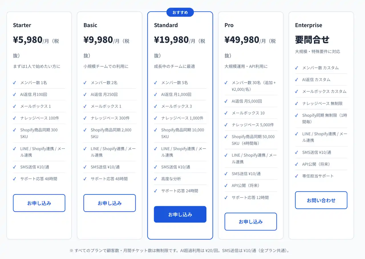 | 対応チャネル:メール、LINE公式アカウント、Shopify、SMS(送信) | |||