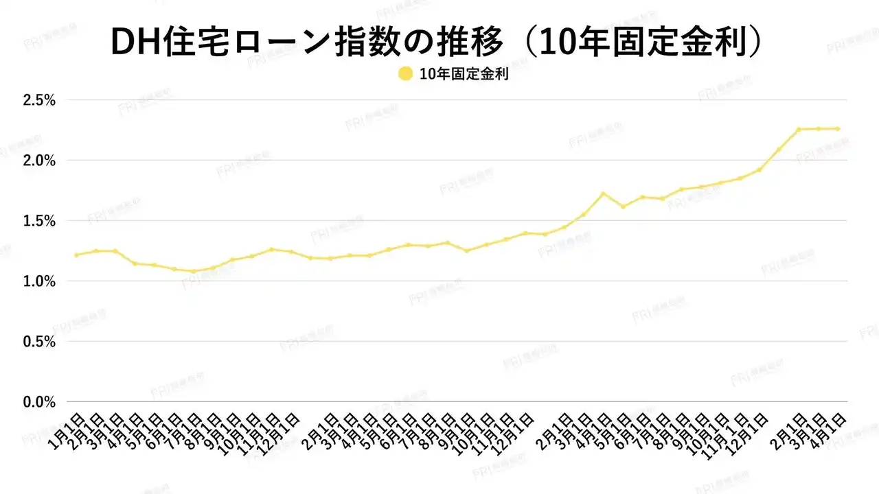 | 2026年3月の10年固定金利は横ばい圏で推移しましたが、DH住宅ローン指数は2.260%と前年の1.551%から大きく上昇しており、中長期的には明確な上昇トレンドにあります。足元では一時的に動きが鈍化し、様子見の局面となっています。 | ||||||||||||||