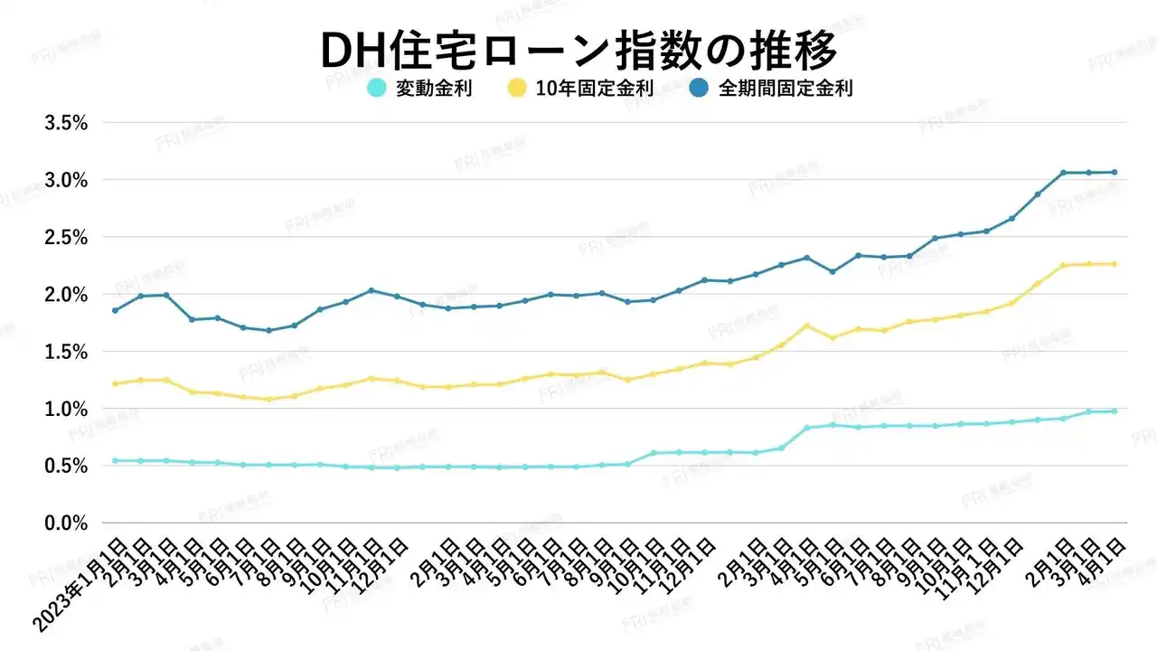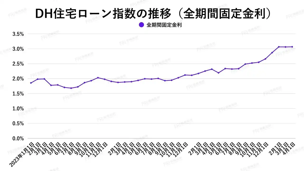 | 2026年3月の全期間固定金利は横ばいでしたが、DH住宅ローン指数は3.064%と前年の2.171%から大きく上昇しており、明確な上昇トレンドが続いています。足元では高水準での推移が続いています。 | ||||||||||||||