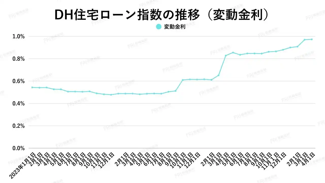 | 2026年3月の変動金利は横ばいでしたが、DH住宅ローン指数は0.973%と前月の0.908%、前年の0.652%を上回り、緩やかな上昇トレンドが継続しています。急激ではないものの、水面下で着実に金利水準が切り上がっている状況です。 | ||||||||||||||