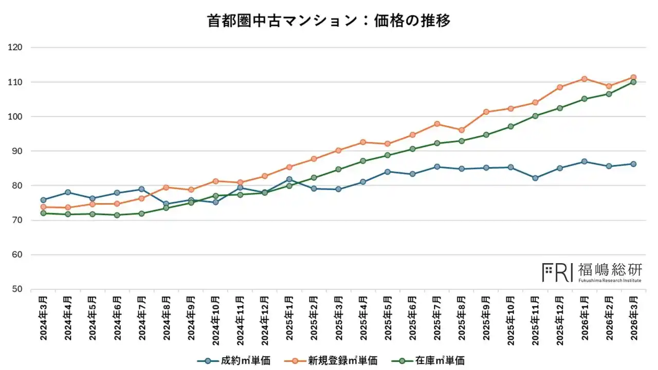 | 東日本不動産流通機構の公表データによれば、首都圏における2026年3月の中古マンション成約平方メートル 単価は、前年同月比で71ヶ月連続の上昇を記録しました。 | ||||||||||||||