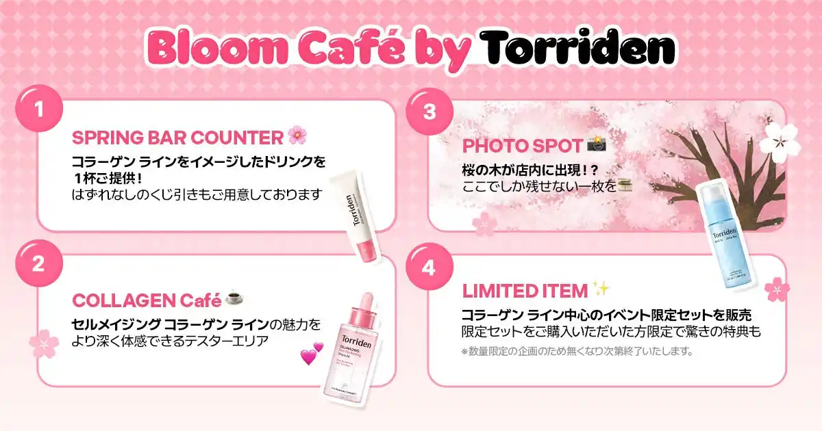 マルマンH&B株式会社(本社:東京都千代田区、代表取締役社長:溝田 勝彦)が展開する韓国スキンケアブランド「Torriden(トリデン)」は、2026年4月29日(水・祝)~5月10日(日)の期間限定で、渋谷「OPENBASE SHIBUYA」にて桜とピンクをテーマとしたポップアップストア『Bloom Cafe by Torriden』をオープンいたします。本ポップアップストアではセルメイジング コラーゲン※1 ラインのピンクをモチーフにしたドリンクの提供や店内でお花見ができるダイナミックな桜の木の設置、新商品を含む限定セットの販売をいたします。 |