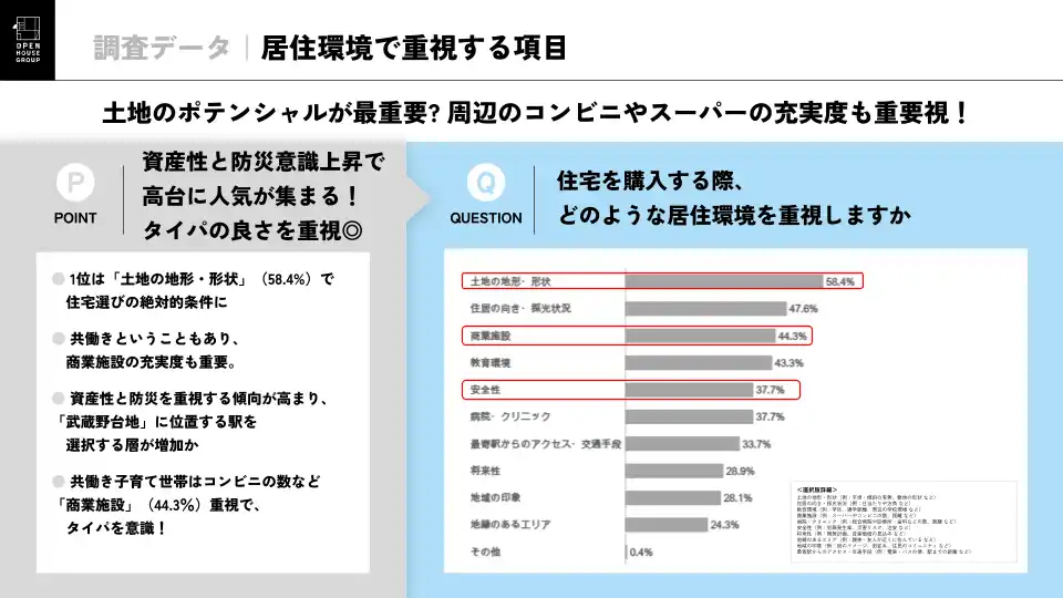 「住宅を購入する際、居住環境のどのような要素を重視しますか」と各設問で例を挙げて聞いたところ、1位は「土地の地形・形状」(58.4%)となりました。昨年のアンケートでも圧倒的1位となっており、【住宅選びの絶対的条件】となっていることが伺えます。人気路線ランキング1位の山手線、3位の中央線沿いの土地は「武蔵野台地」に位置する駅が多く資産価値の高さに加えて、災害リスクの意識が高い点も評価されている理由の1つのようです。また、共働き世帯だからこそ「商業施設」も3位に入り(44.3%)、スーパーやコンビニとの距離や数といった買い物の利便性を重視することが分かりました。 |
