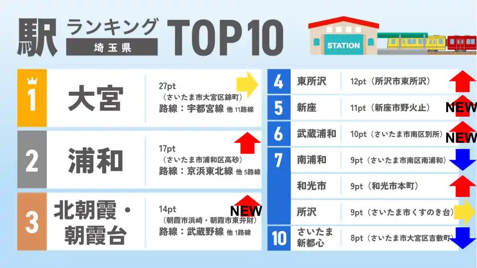 埼玉県はTOP10にすでにTOP10入りした駅の中から穴場駅だと思う駅を2駅と、TOP10外で追加する場合の1駅を候補に挙げました。 |