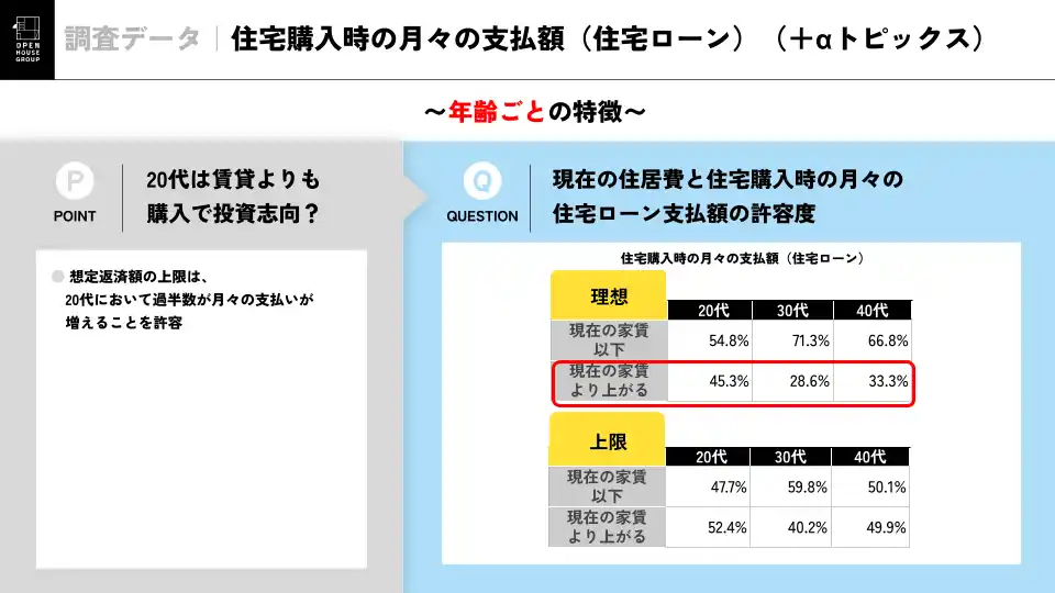 ・月々の住居費が上がることを許容する割合は、20代が他の年代を抑えて高い結果に |