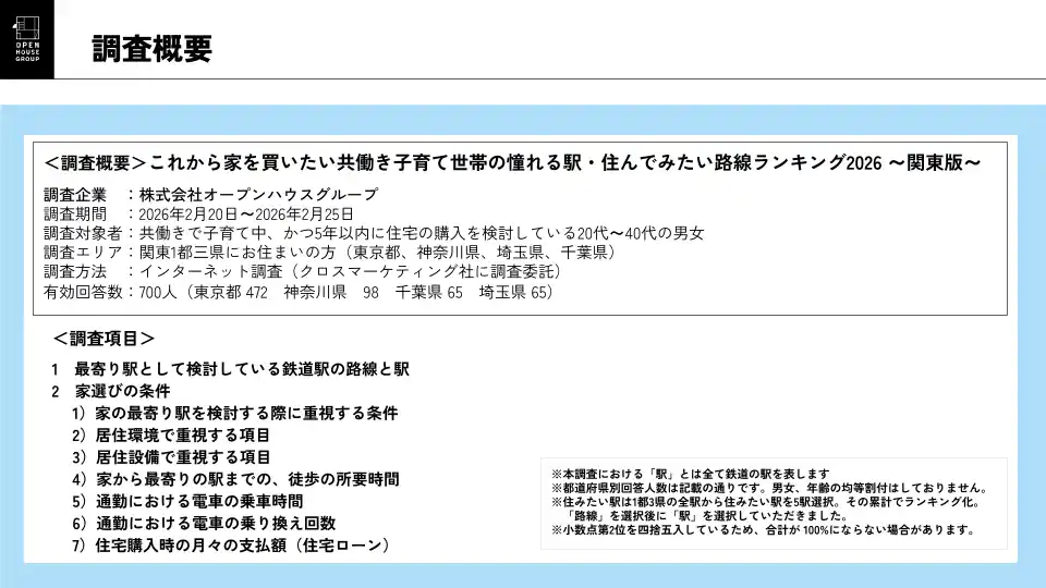 株式会社オープンハウスグループ(本社:東京都千代田区、代表取締役社長:福岡 良介、以下「当社」)は、「これから家を買いたい共働き子育て世帯が住みたい駅・路線ランキング2026 ~関東版~」の調査結果を発表いたしました。また、土地の仕入れから設計・建築・販売までを一貫して手掛ける「製販一体」の体制を持つ当社ならではの視点から、不動産のプロが選ぶ「これから注目すべき穴場駅」についても併せてご紹介しております。 |