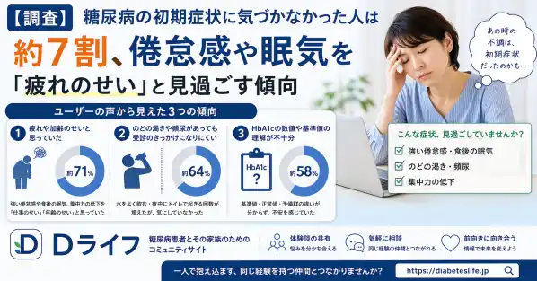 一つ目に、初期症状を「疲れ」や「加齢」のせいと捉えていた方が多いという傾向が見られました。強い倦怠感、食後の眠気、集中力の低下といった症状について、「仕事が忙しいからだと思っていた」「年齢的なものだと諦めていた」という声が多く寄せられています。振り返ってから初めて、これらが血糖値の乱れによるサインだった可能性に思い至るケースが目立ちました。
