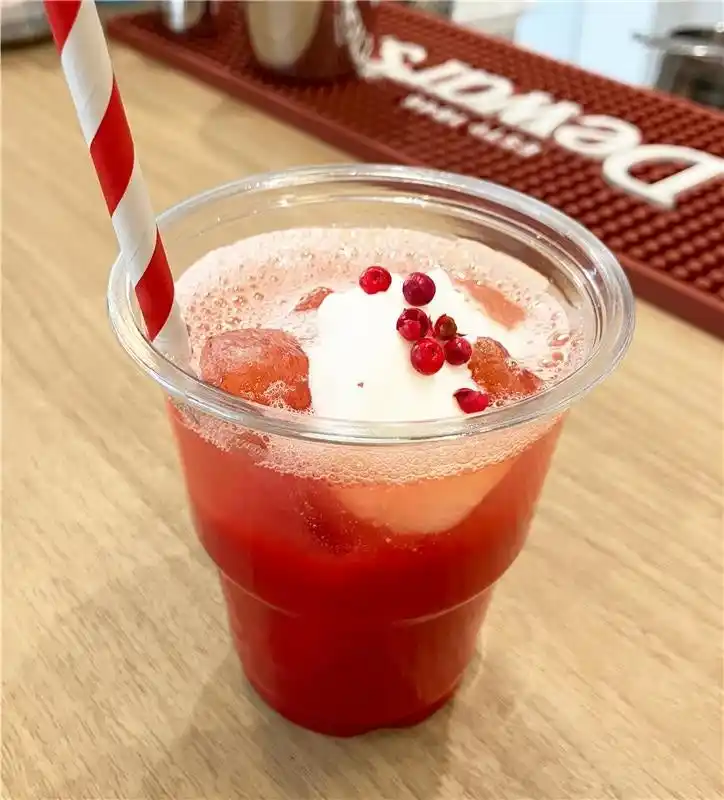 レンフロ・ジャパン展示会恒例テーマジュース。今回は「ホカロン」テーマで赤いザクロ×ブラッドオレンジジュースにヨーグルトをトッピング。 |