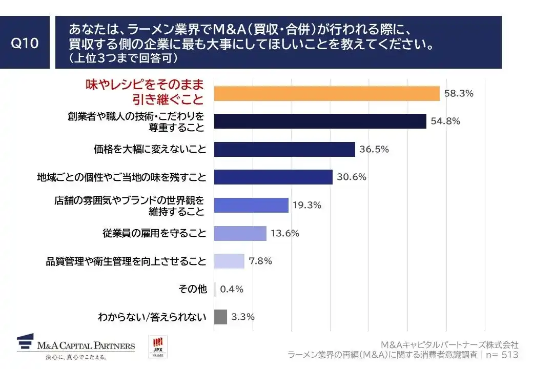 「Q10. あなたは、ラーメン業界でM&A(買収・合併)が行われる際に、買収する側の企業に最も大事にしてほしいことを教えてください。(上位3つまで回答可)」(n=513)と質問したところ、「味やレシピをそのまま引き継ぐこと」が58.3%、「創業者や職人の技術・こだわりを尊重すること」が54.8%、「価格を大幅に変えないこと」が36.5%という回答となりました。 |