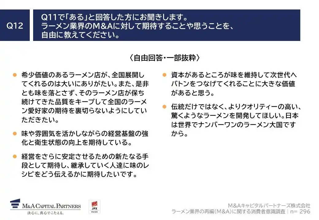 「Q12. Q11で「ある」と回答した方にお聞きします。ラーメン業界のM&Aに対して期待することや思うことを、自由に教えてください。」