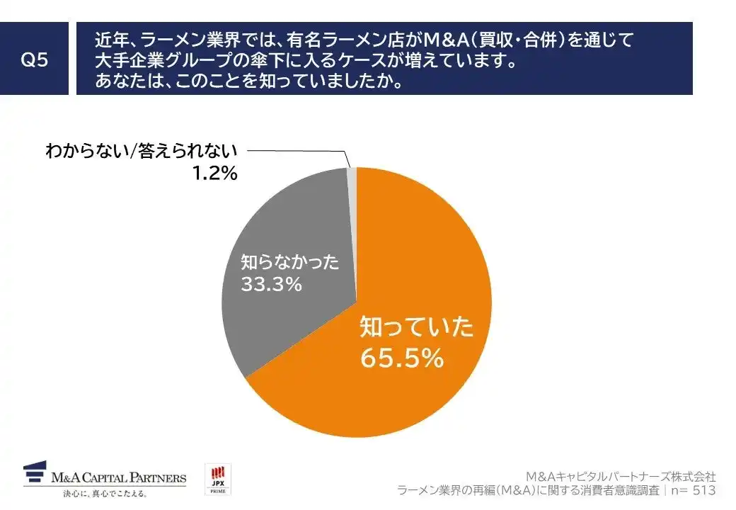 「Q5. 近年、ラーメン業界では、有名ラーメン店がM&A(買収・合併)を通じて大手企業グループの傘下に入るケースが増えています。あなたは、このことを知っていましたか。」(n=513)と質問したところ、「知っていた」が65.5%、「知らなかった」が33.3%という回答となりました。 |