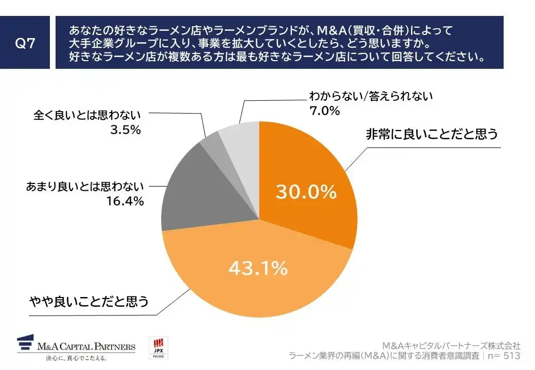 「Q7. あなたの好きなラーメン店やラーメンブランドが、M&A(買収・合併)によって大手企業グループに入り、事業を拡大していくとしたら、どう思いますか。好きなラーメン店が複数ある方は最も好きなラーメン店について回答してください。」(n=513)と質問したところ、「非常に良いことだと思う」が30.0%、「やや良いことだと思う」が43.1%という回答となりました。。 |
