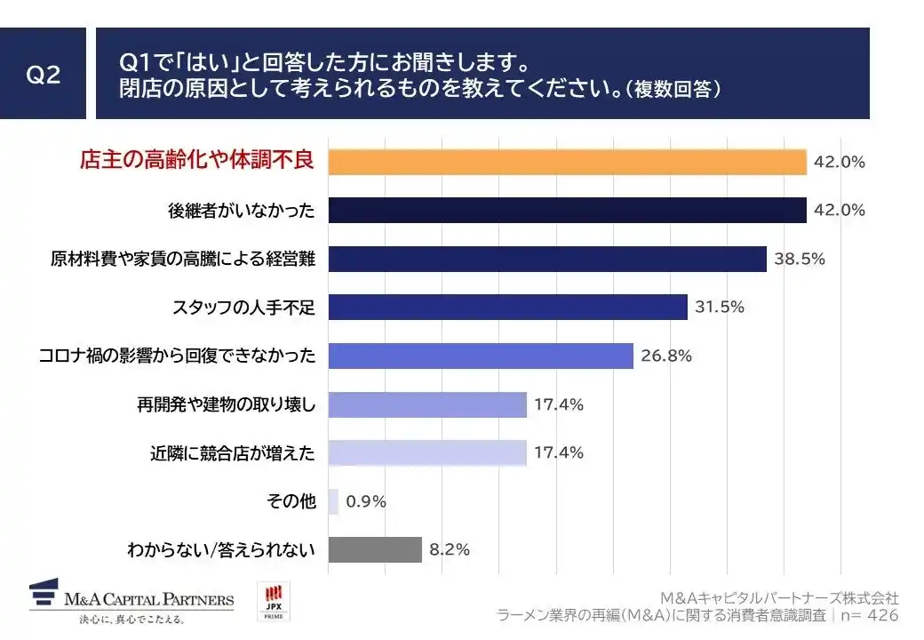 「Q2. Q1で「はい」と回答した方にお聞きします。閉店の原因として考えられるものを教えてください。(複数回答)」(n=426)と質問したところ、「店主の高齢化や体調不良」が42.0%、「後継者がいなかった」が42.0%、「原材料費や家賃の高騰による経営難」が38.5%という回答となりました。 |