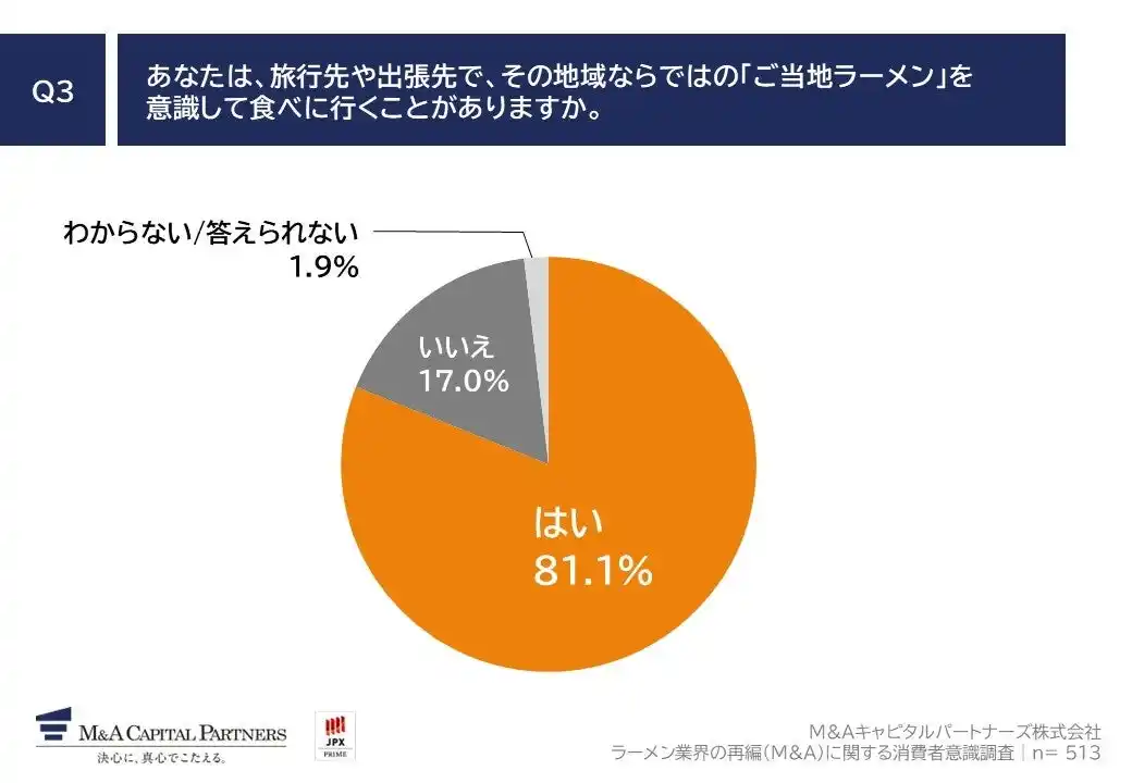 「Q3. あなたは、旅行先や出張先で、その地域ならではの「ご当地ラーメン」を意識して食べに行くことがありますか。」(n=513)と質問したところ、「はい」が81.1%、「いいえ」が17.0%という回答となりました。 |