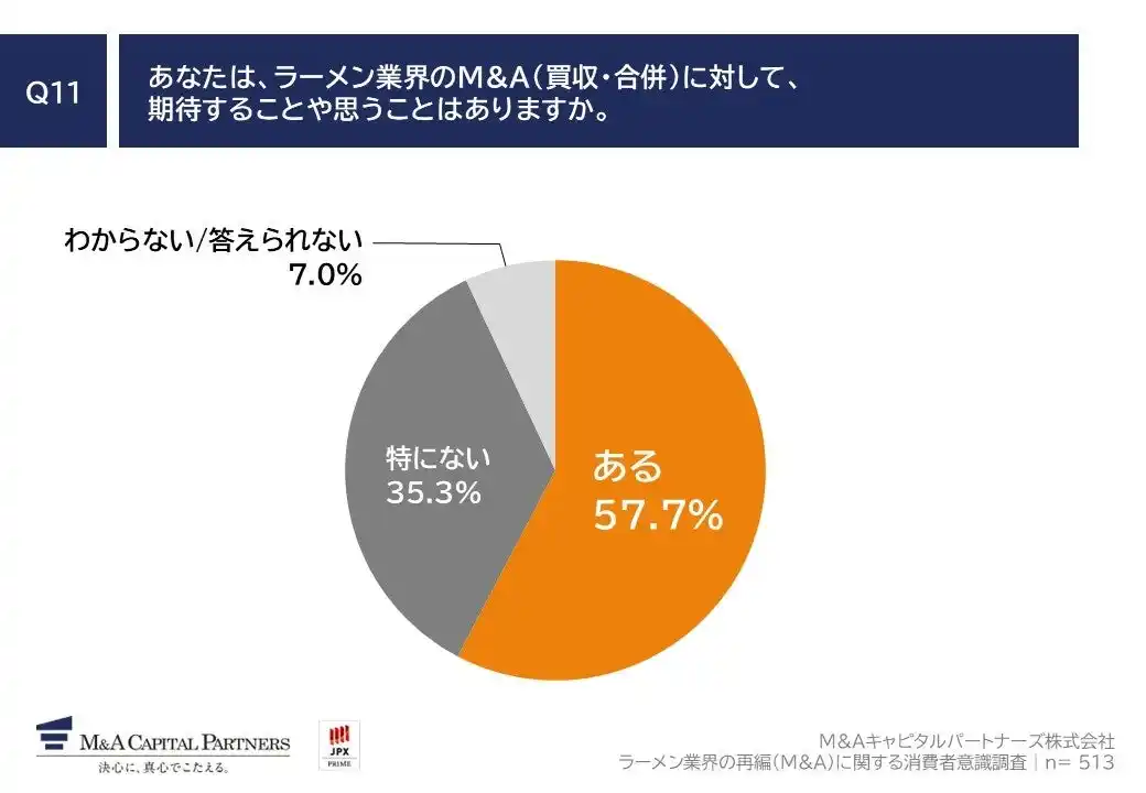 「Q11. あなたは、ラーメン業界のM&A(買収・合併)に対して、期待することや思うことはありますか。」(n=513)と質問したところ、「ある」が57.7%、「特にない」が35.3%という回答となりました。 |