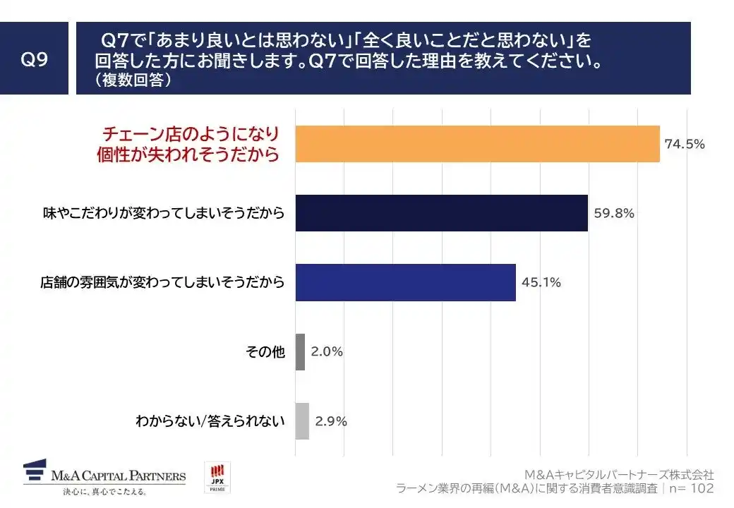 「Q9. Q7で「あまり良いとは思わない」「全く良いことだと思わない」を回答した方にお聞きします。Q7で回答した理由を教えてください。(複数回答)」(n=102)と質問したところ、「チェーン店のようになり個性が失われそうだから」が74.5%、「味やこだわりが変わってしまいそうだから」が59.8%、「店舗の雰囲気が変わってしまいそうだから」が45.1%という回答となりました。 |