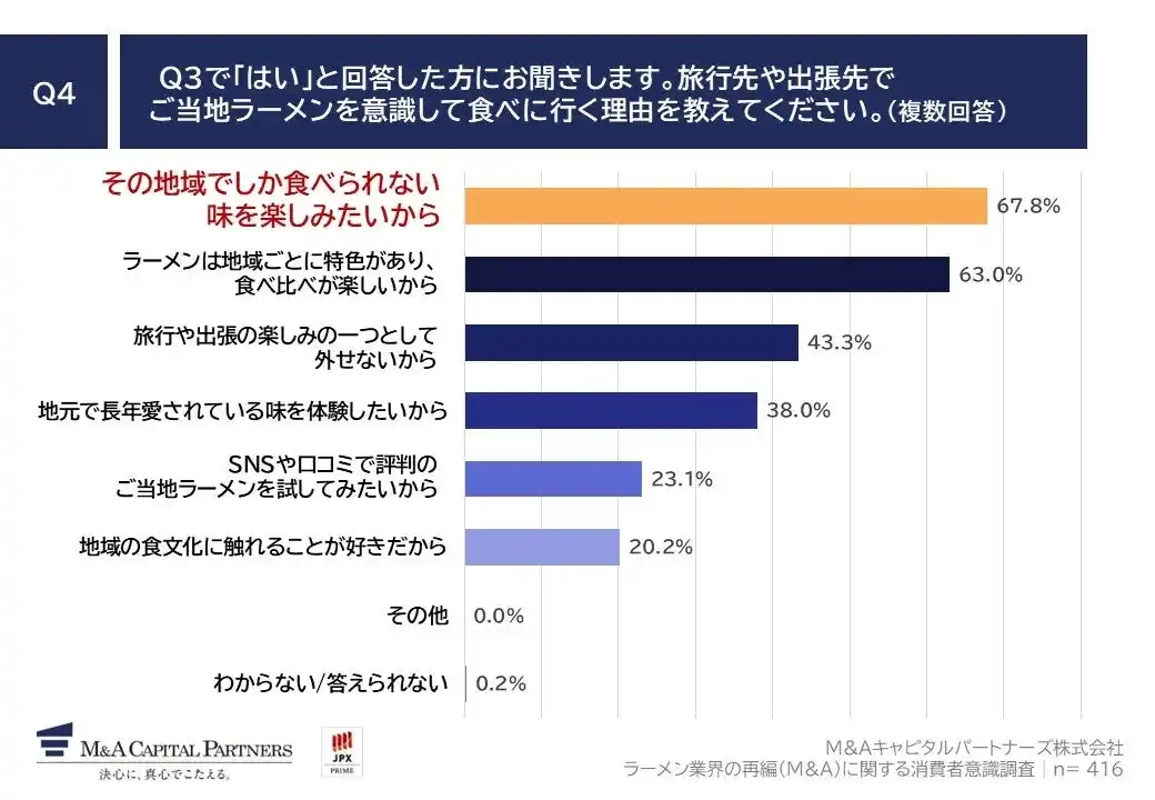 「Q4. Q3で「はい」と回答した方にお聞きします。旅行先や出張先でご当地ラーメンを意識して食べに行く理由を教えてください。(複数回答)」