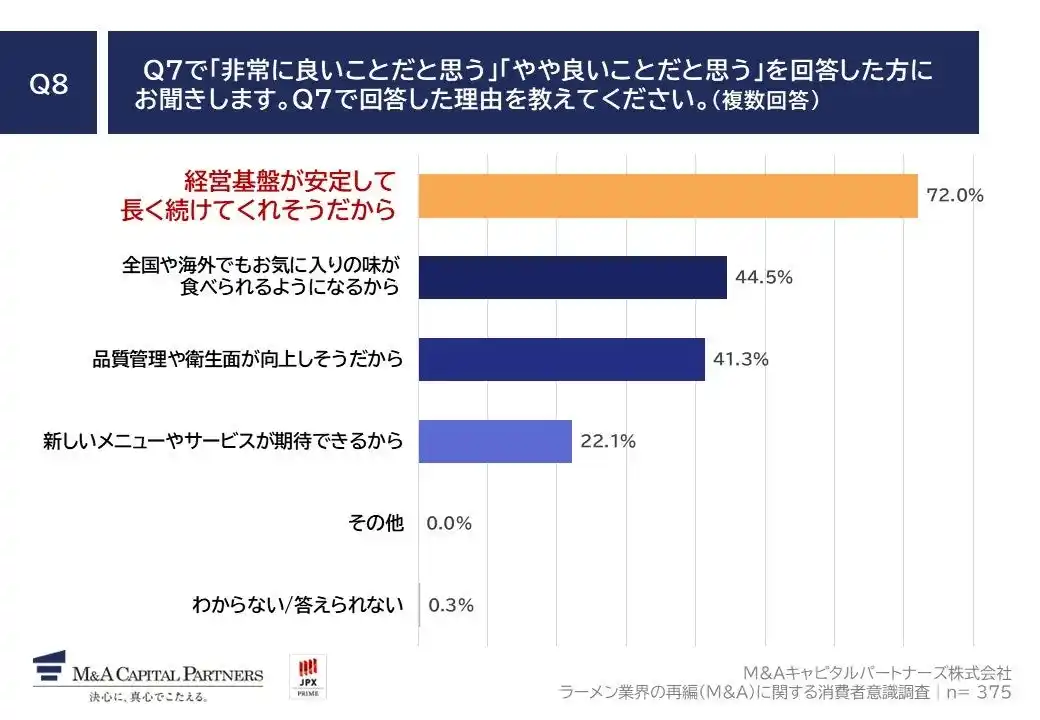 「Q8. Q7で「非常に良いことだと思う」「やや良いことだと思う」を回答した方にお聞きします。Q7で回答した理由を教えてください。(複数回答)」(n=375)と質問したところ、「経営基盤が安定して長く続けてくれそうだから」が72.0%、「全国や海外でもお気に入りの味が食べられるようになるから」が44.5%、「品質管理や衛生面が向上しそうだから」が41.3%という回答となりました。 |