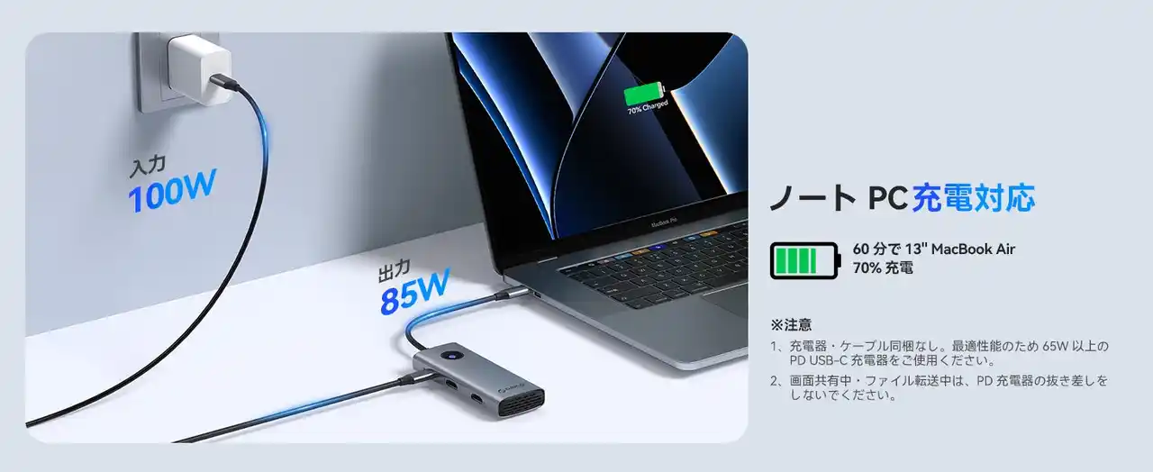 100W PD急速充電: パソコンを急速充電しながら、他のポートをフル活用。バッテリー残量を気にする必要はありません。 |