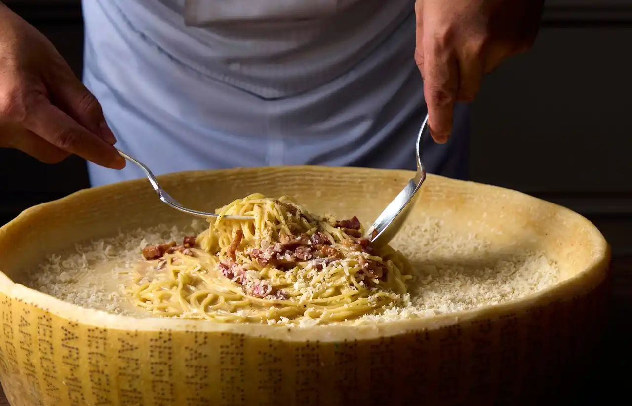 目の前でチーズを溶かして仕上げる「ホールチーズで仕上げるスパゲッティ・カルボナーラ」 |