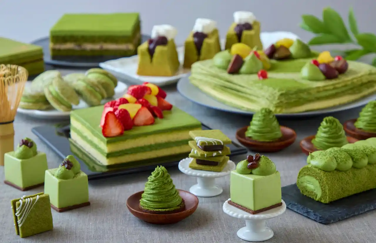 抹茶のショートケーキ / 抹茶のクッキーサンド / 抹茶のモンブラン / 抹茶のオペラ / 抹茶のブランマンジェ / 抹茶風味のわらび餅 / 抹茶の串団子 / マカロン など |