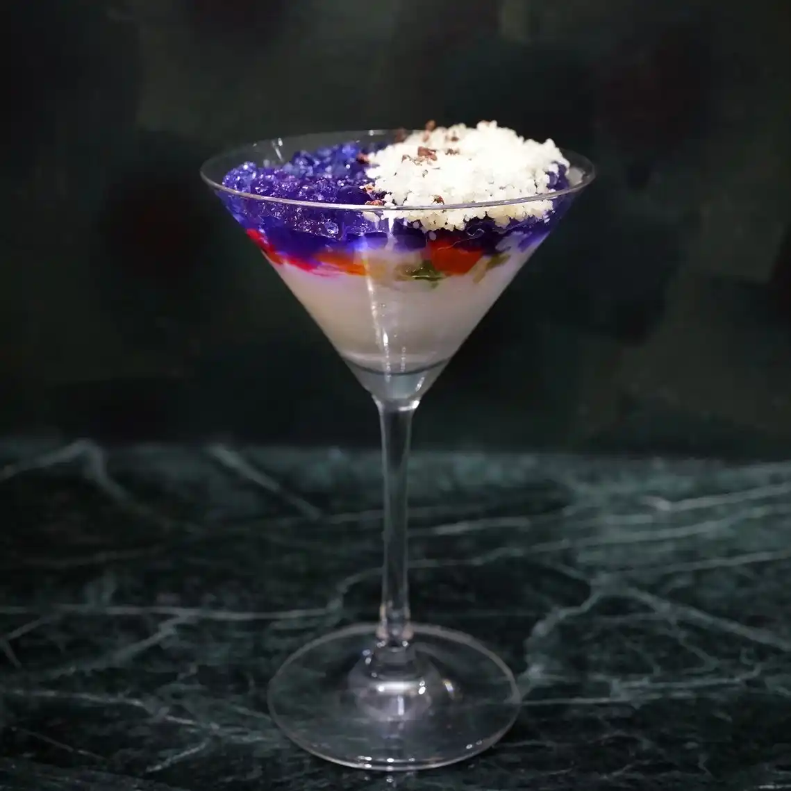 ・アイランド ・ブルー・ジントニック(アルコール) 2,200円(税込) 目の前に広がる澄み渡る海を、鮮やかなブルーのグラデーションで表現いたしました。 プレミアムジンとブルーキュラソーが織りなす、爽やかで奥行きのある味わいは、まさに島でのバケーションの始まりにふさわしい一杯です。心地よい潮風を感じるような、上質なひとときを演出します。 |