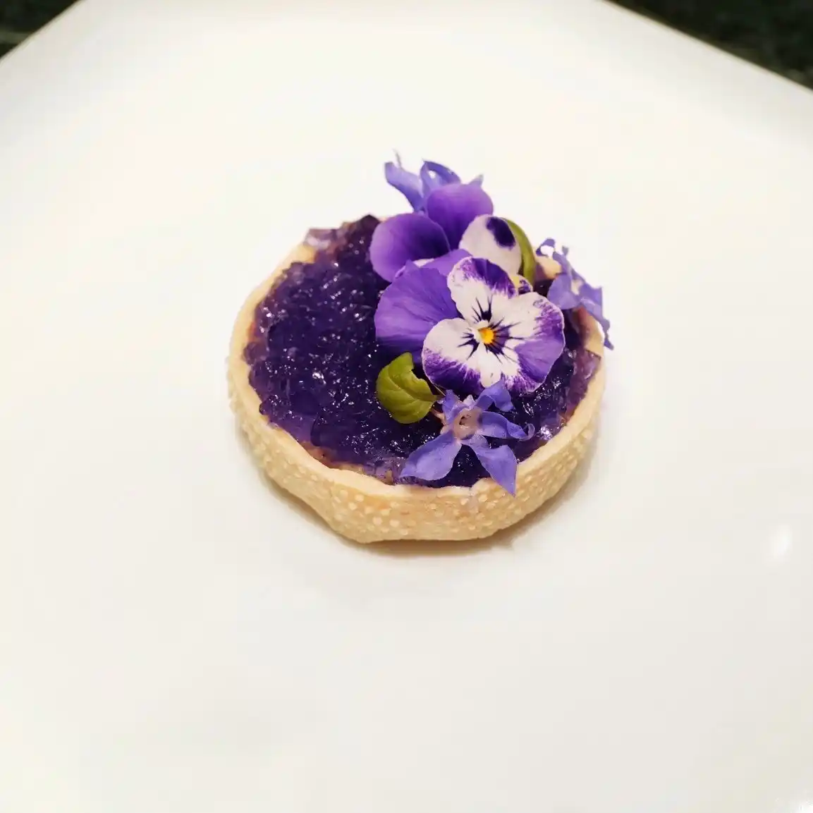 | 香ばしく焼き上げた焼き茄子と、京都老舗味噌屋「山利」の白味噌のコクに、ローズマリー香るバタフライピーのジュレをアクセントに重ねたタルトです。 | |||