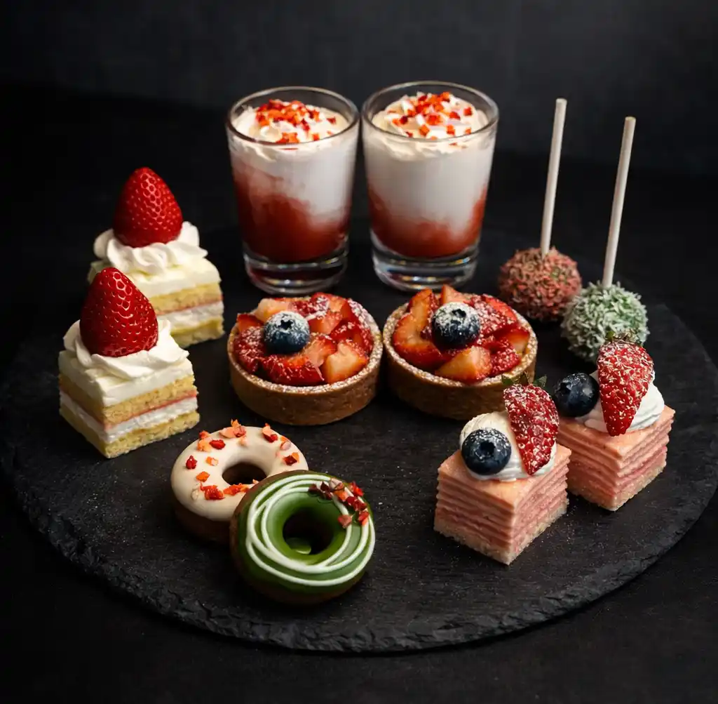 | スイーツには、ストロベリーヨーグルトオレ、抹茶ドーナツ、いちごのタルト、ミルクレープ、抹茶ロリポップ、ショートケーキをご用意。見た目の華やかさと味わいのバランスを両立したラインナップです。 | |||||||||||||||||||