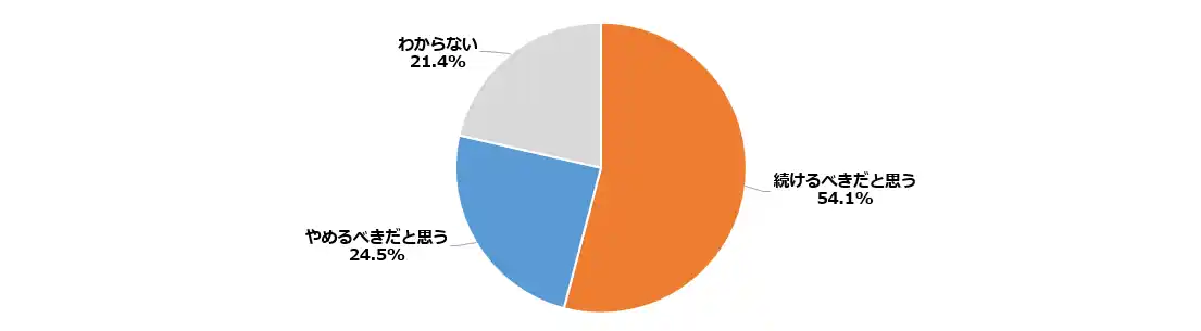 「続けるべきだと思う」とした人を地域別に見ると、中部、九州が6割台で最も多く、関東、近畿が4割台で最低だった。職業別では、医療、福祉関係の職員等が7割台でトップとなり、公務員(団体職員や教職員を除く)と学生が4割台で最も低かった。支持政党別では、立憲民主党(中道を同時に支持する人を除く)とれいわが7割台で最も多く、中道改革連合(立憲または公明を同時に支持する人を含む)が3割台で最少だった。自民は6割台。 |