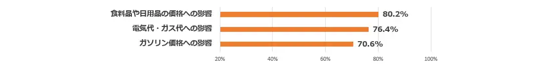 イラン情勢を受け、日常生活で気にしていることを複数回答で聞くと、「食料品や日用品の価格への影響」が80.2%で最も多く、「電気代・ガス代への影響」76.4%、「ガソリン価格への影響」70.6%と続いた。 |