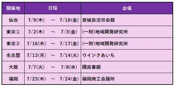 会場コースでは、全国5都市で開催いたします。「Webコース」は配信後に視聴可能となり、自由に中断・再開が可能です。 |
