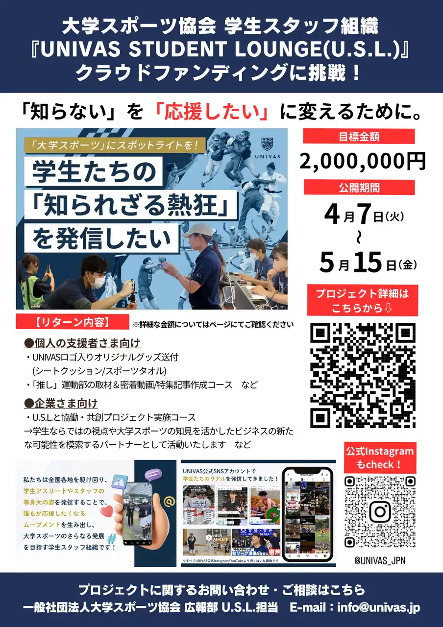 一般社団法人大学スポーツ協会(所在地:東京都千代田区、会長:福原紀彦、以下 UNIVAS)における学生組織『UNIVAS STUDENT LOUNGE (U.S.L.)』は、学生アスリートやスタッフの魅力をより広く社会へ届けるため、取材遠征費の確保を目的としたクラウドファンディングに現在挑戦しております。 |