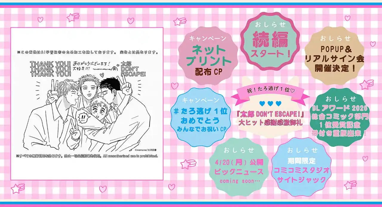 本日より、BL専門店コミコミスタジオのHPを「たろ逃げ」が期間限定ジャック! |