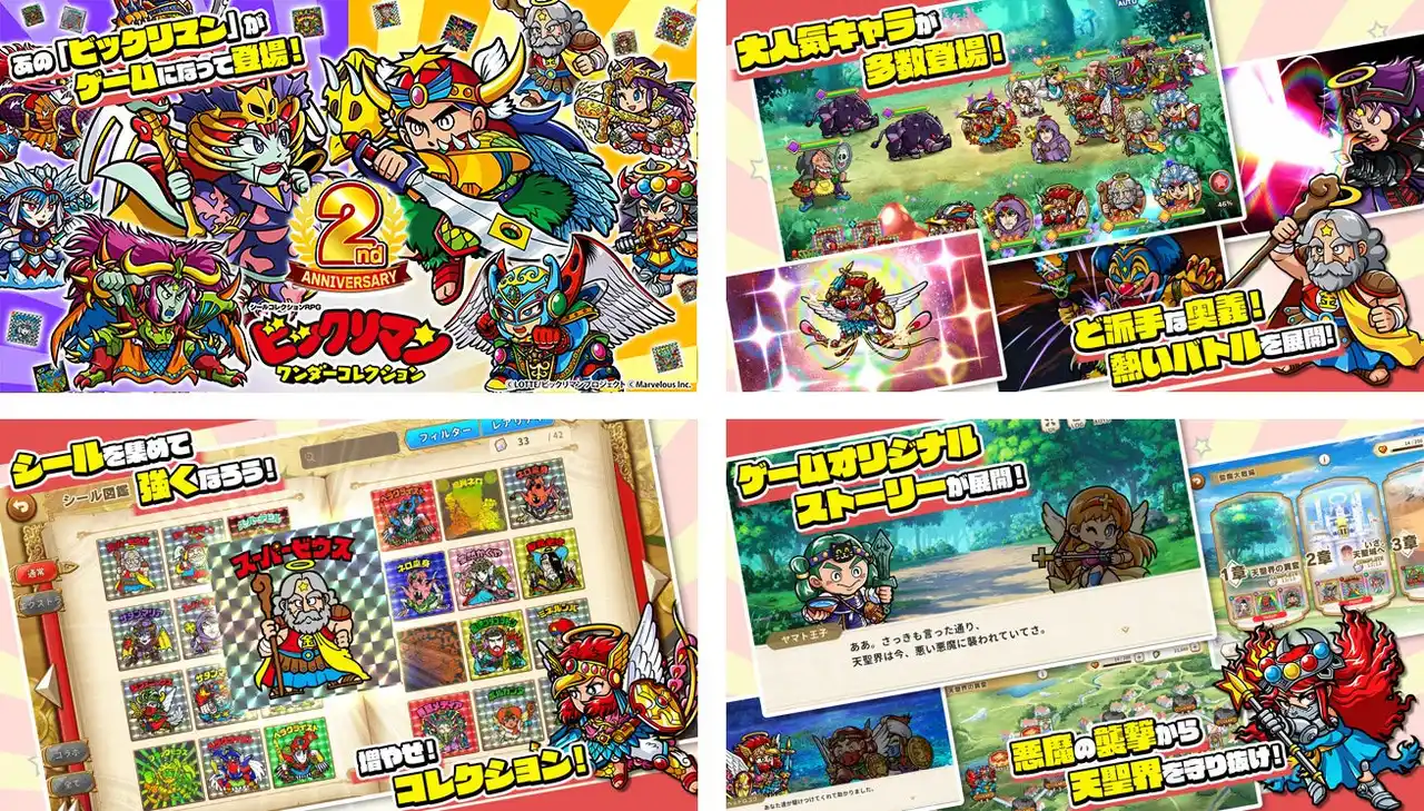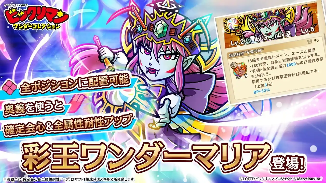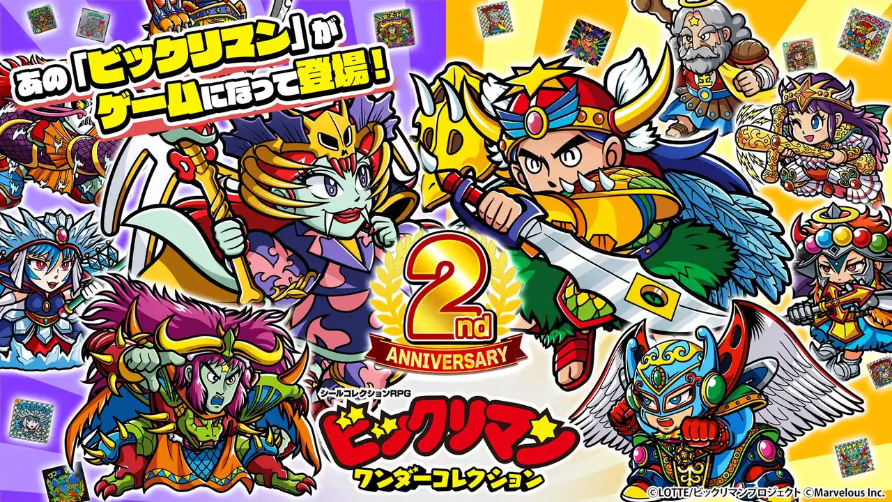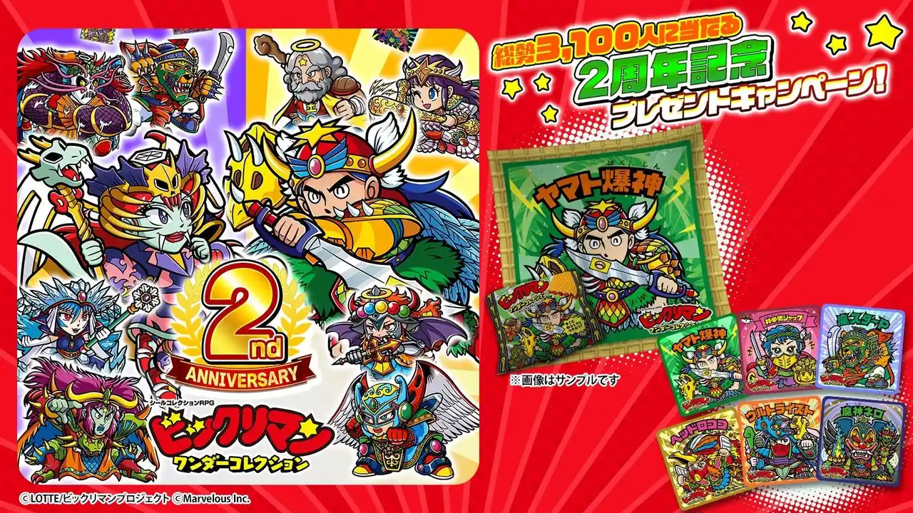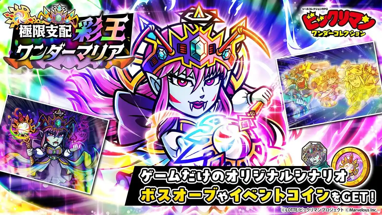 株式会社マーベラス(代表取締役社長:照井 慎一/所在地:東京都品川区)は、シールコレクションRPG『ビックリマン・ワンダーコレクション』にて無料100連キャンペーンや総勢3,100人に当たる「2周年記念プレゼントキャンペーン!」等を含む「ワンコレ2周年キャンペーン」が2026年4月17日に開催されたことをお知らせいたします。また併せて期間限定イベント「極限支配 彩王ワンダーマリア」、「若異聖神と魔彩王ガチャ」等を開始いたしました。 |