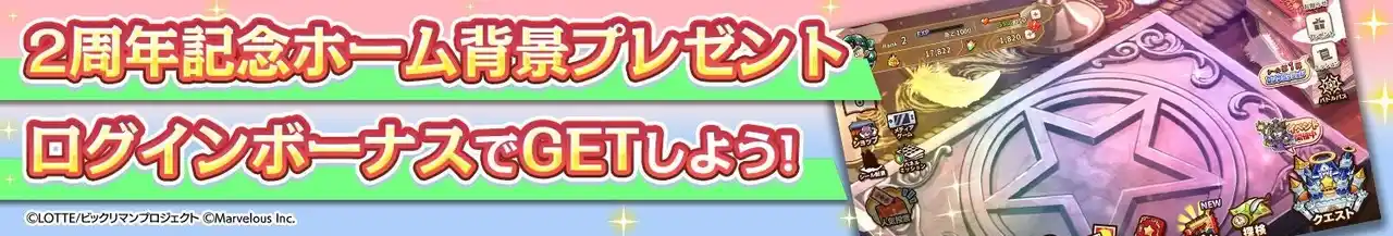 本メンテナンス後より、2周年を記念した特別な「ホーム背景」を獲得できる、ログインボーナスを開始いたしました。 |