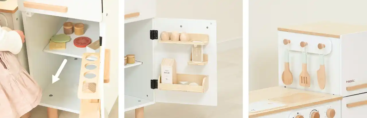 「変化するままごとキッチン」のキッチンと冷蔵庫はそれぞれ単体での購入も可能で、おままごとツールも付属しています。 |