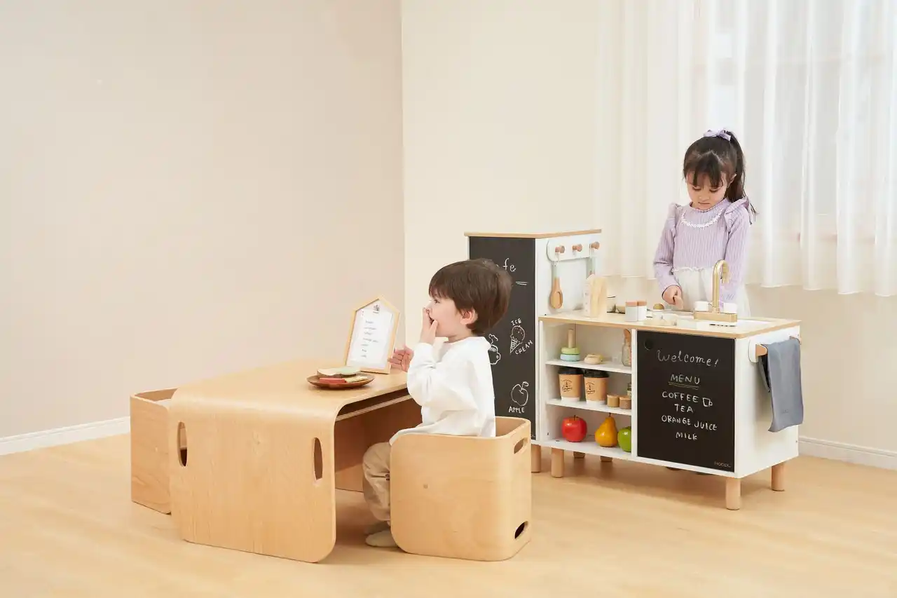 また、「子どもが生まれる前はインテリアにこだわっていたけれど、子ども用品はカラフルでにぎやかなものばかり」「子ども第一に考えると自分好みのインテリアは諦めるしかない」と割り切る方も多いはず。子どもに楽しんで欲しいのが一番!だけど、おしゃれなインテリア作りも諦めたくない!そんな親御さんたちの想いを両方実現するままごとキッチンです。 |