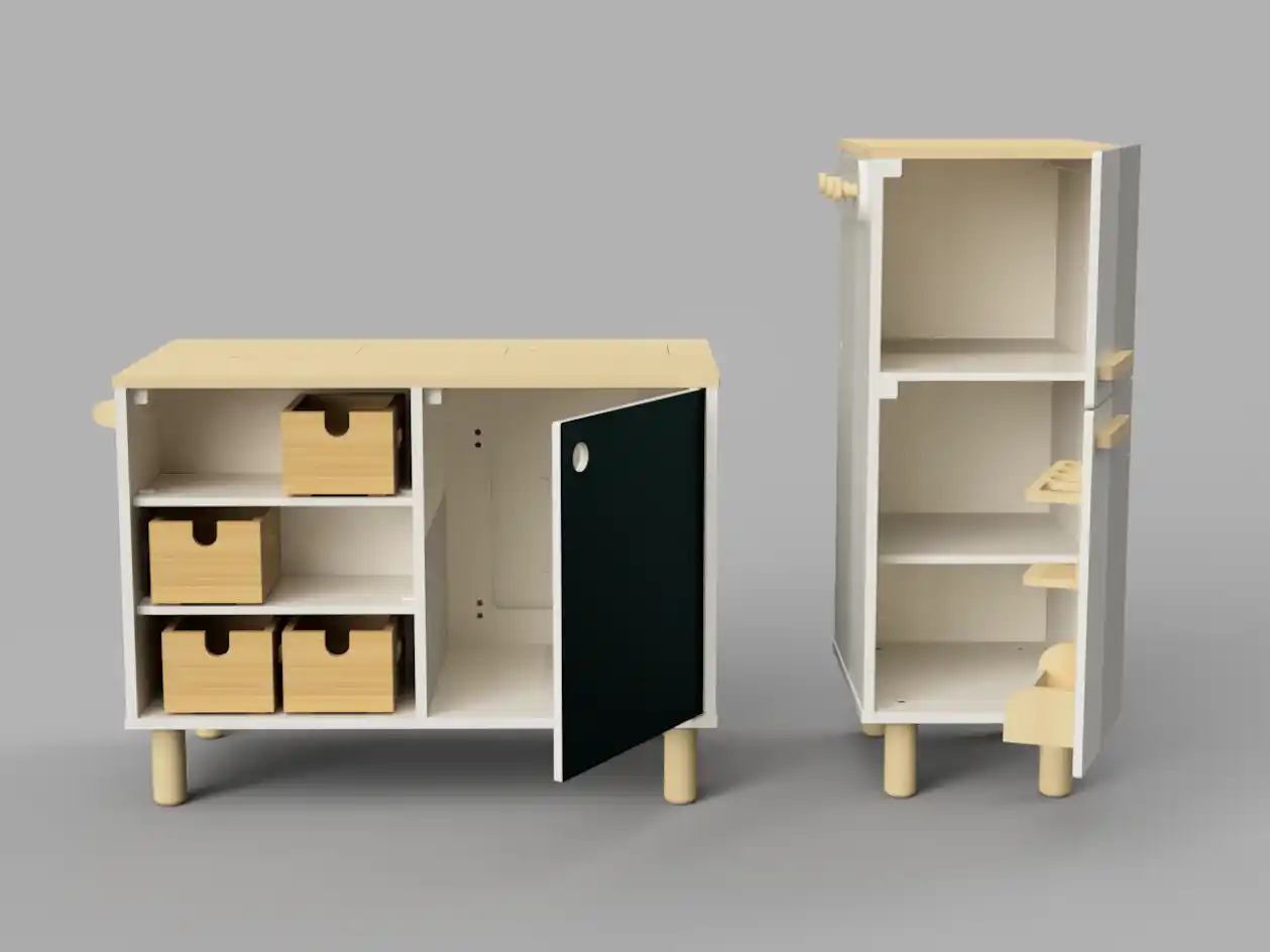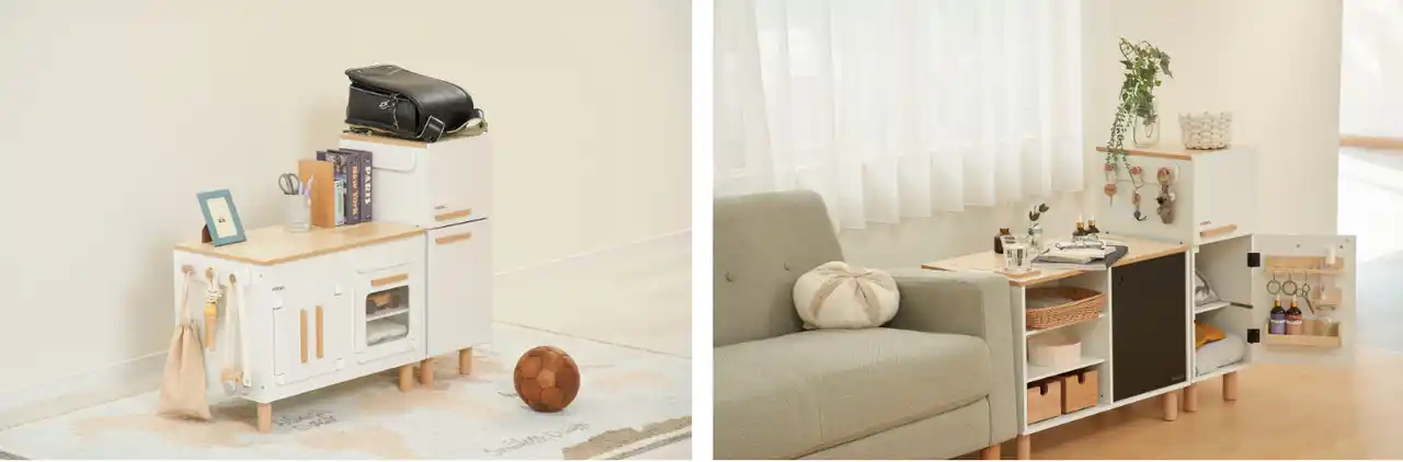 「変化するままごとキッチン」はお子様が成長した後も、キャビネットとして使用できるデザインが特徴です。 |