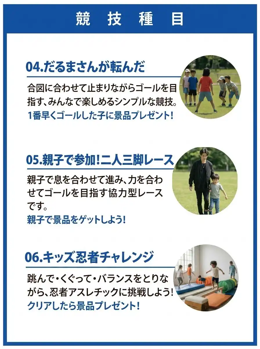 本イベントでは、子どもだけでなく保護者の方も一緒に楽しめる競技をご用意しています。 |