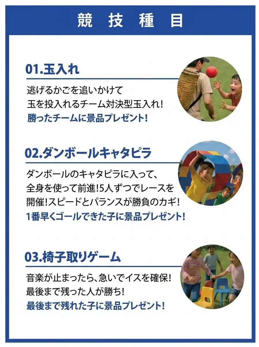 玉入れ・キャタピラレース・二人三脚など人気競技が集合 |