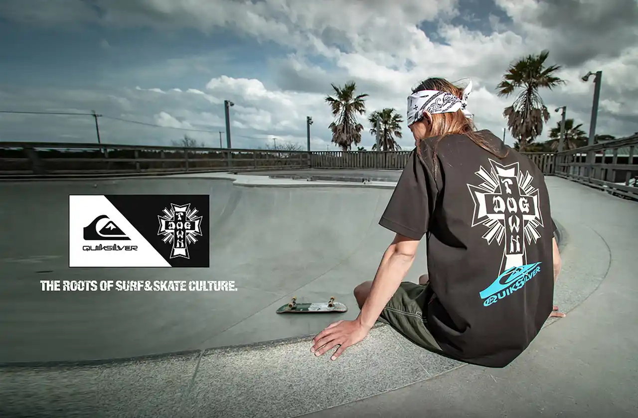 本コレクションでは、DOGTOWNのアイコニックな「クロスロゴ」と、QUIKSILVERの象徴である「マウンテン&ウェーブ」を融合させたスペシャルロゴを採用。 |