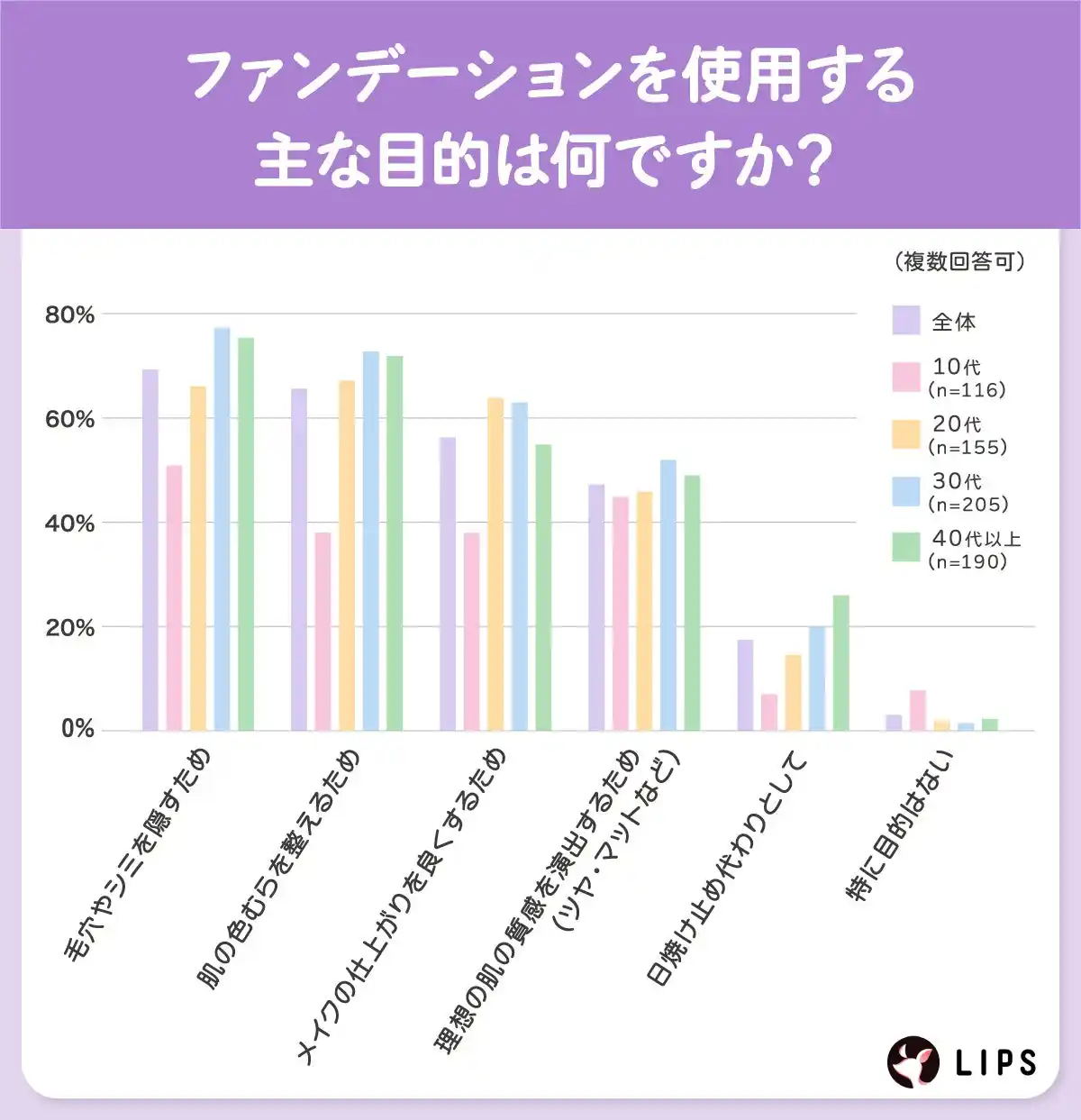 使用目的は毛穴やシミ隠しなど肌悩みのカバーを目的とする人が多い |
