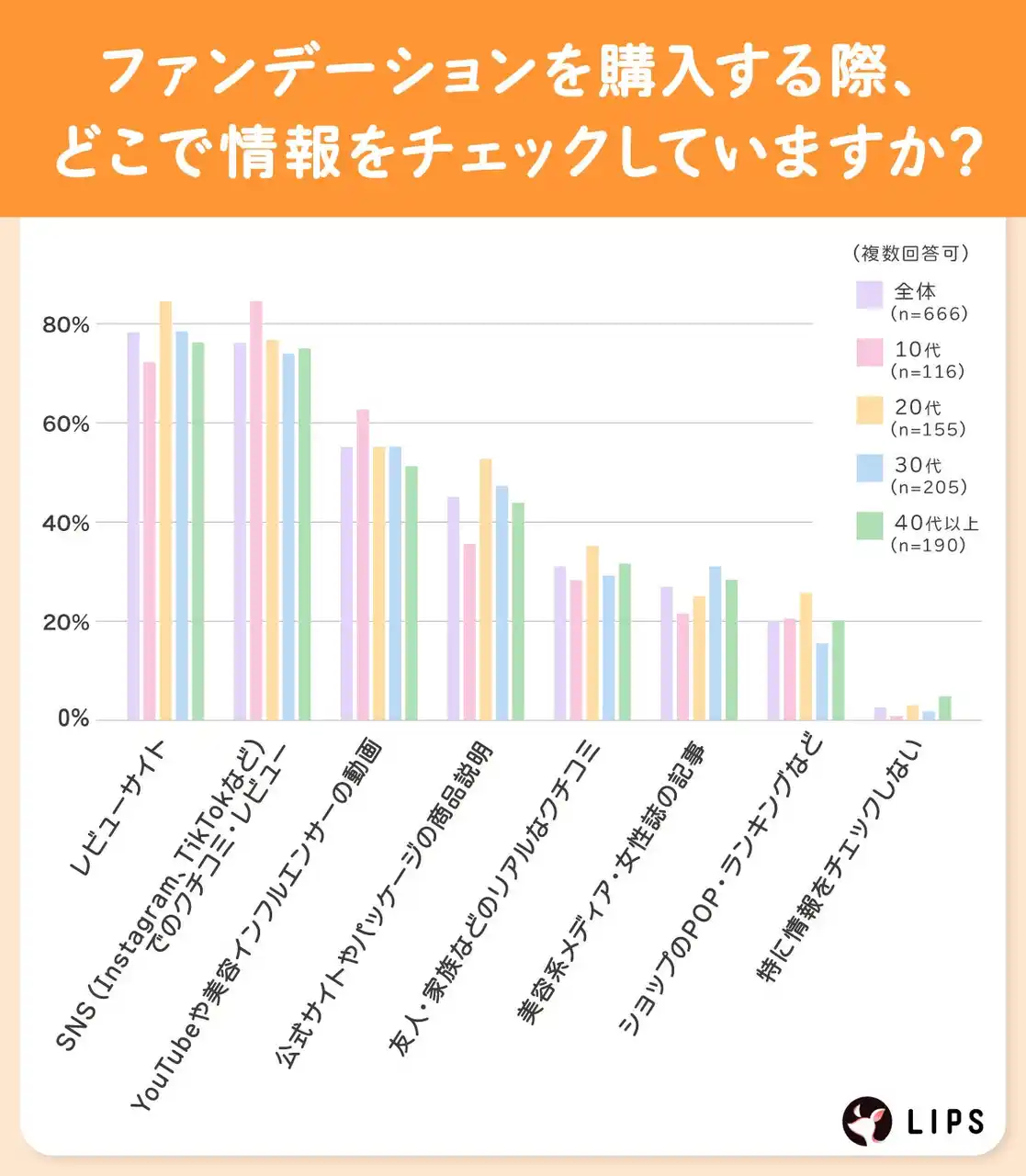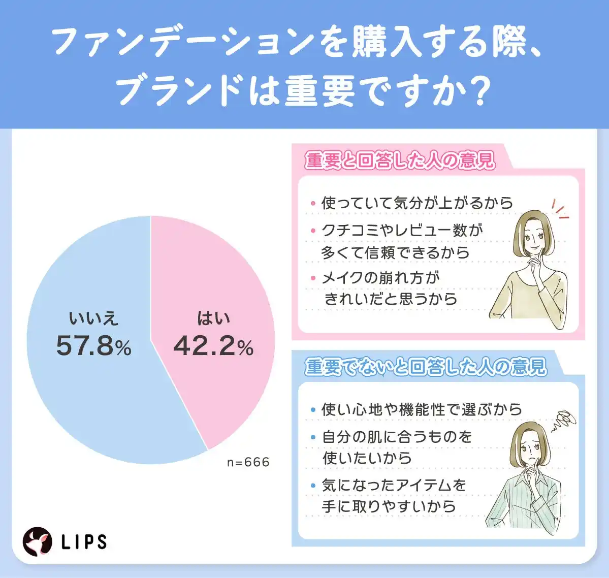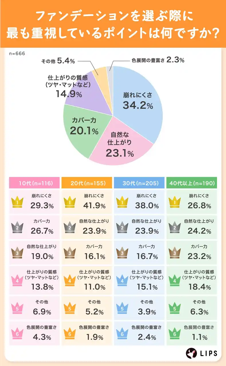 株式会社AppBrew(本社所在地:東京都文京区、代表取締役:松田崇)が運営する美容プラットフォーム「LIPS(リップス)」は、「ファンデーション」についてLIPSユーザー666名を対象に、アンケート調査を実施しました。今回の調査では、ファンデーションを選ぶ上での重視点から情報収集の方法まで、ユーザーの具体的な行動や価値観を調査しました。 |
