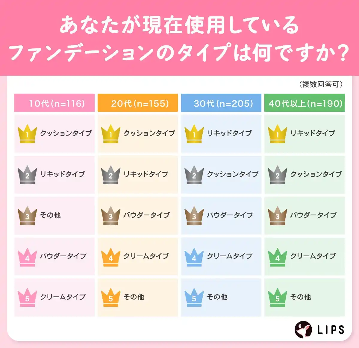「リキッドタイプ」はカバー力と仕上がりの安定感、「クッションタイプ」は手軽さと時短ニーズに応える点が支持を集めた背景にあると考えられます。 |