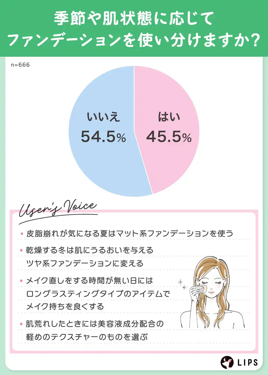 ファンデーションを使い分けている人が45.5%、使い分けていない人が54.5%と使い分けていないとの回答がやや上回りました。 |