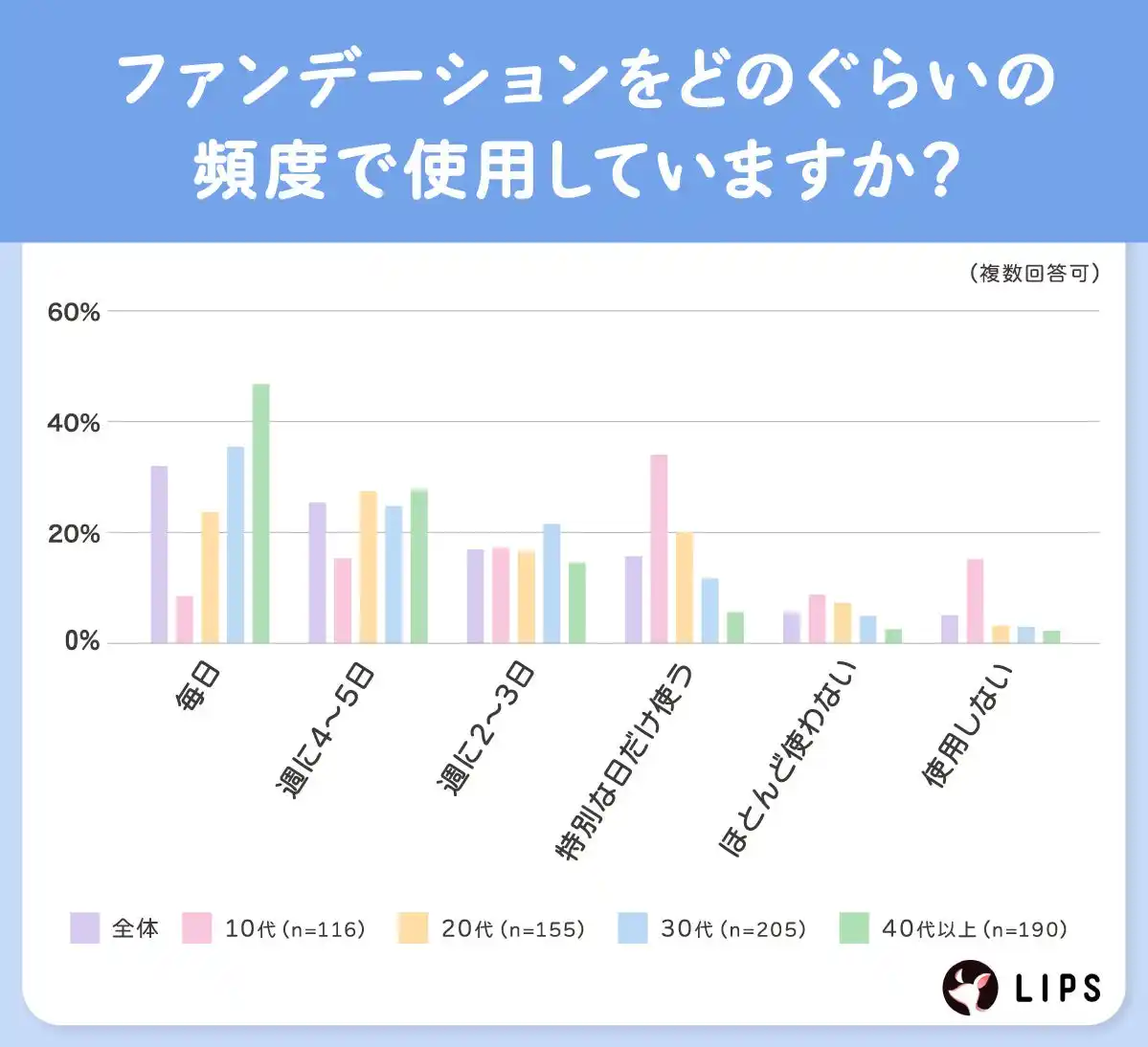 一方で、10代は「特別な日だけ使う」が33.6%と最多で、TPOに合わせて使い分ける傾向が顕著です。全体としては「週に4~5日」(24.9%)、「週に2~3日」(17.9%)も一定数おり、ライフスタイルや年代によって使用頻度に違いが見られる結果となりました。 |